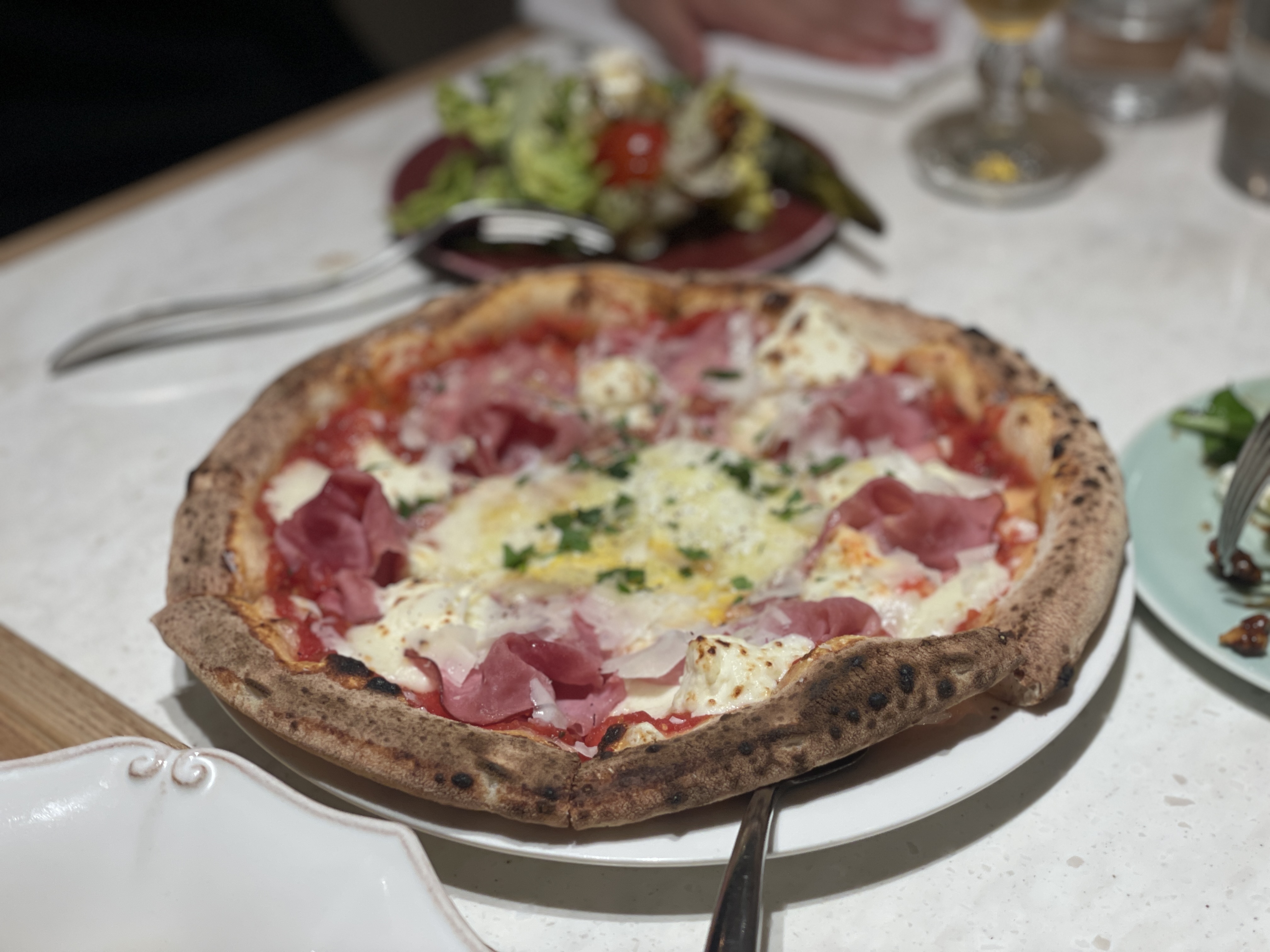저희가 주문한 피자는 비스마르크 피자였는데, 햄과 치즈, 수란이 올라간 피자였어요.
