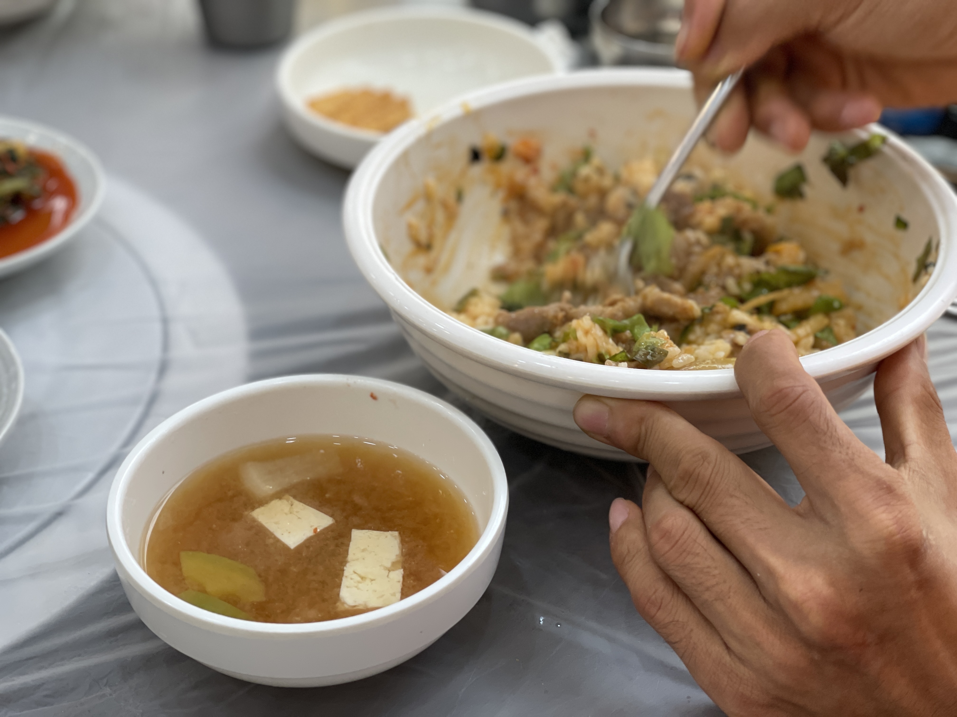순두부수제비와 제육덮밥 메뉴를 골고루 주문했는데, 맛있어보이는 반찬이 나오네요!