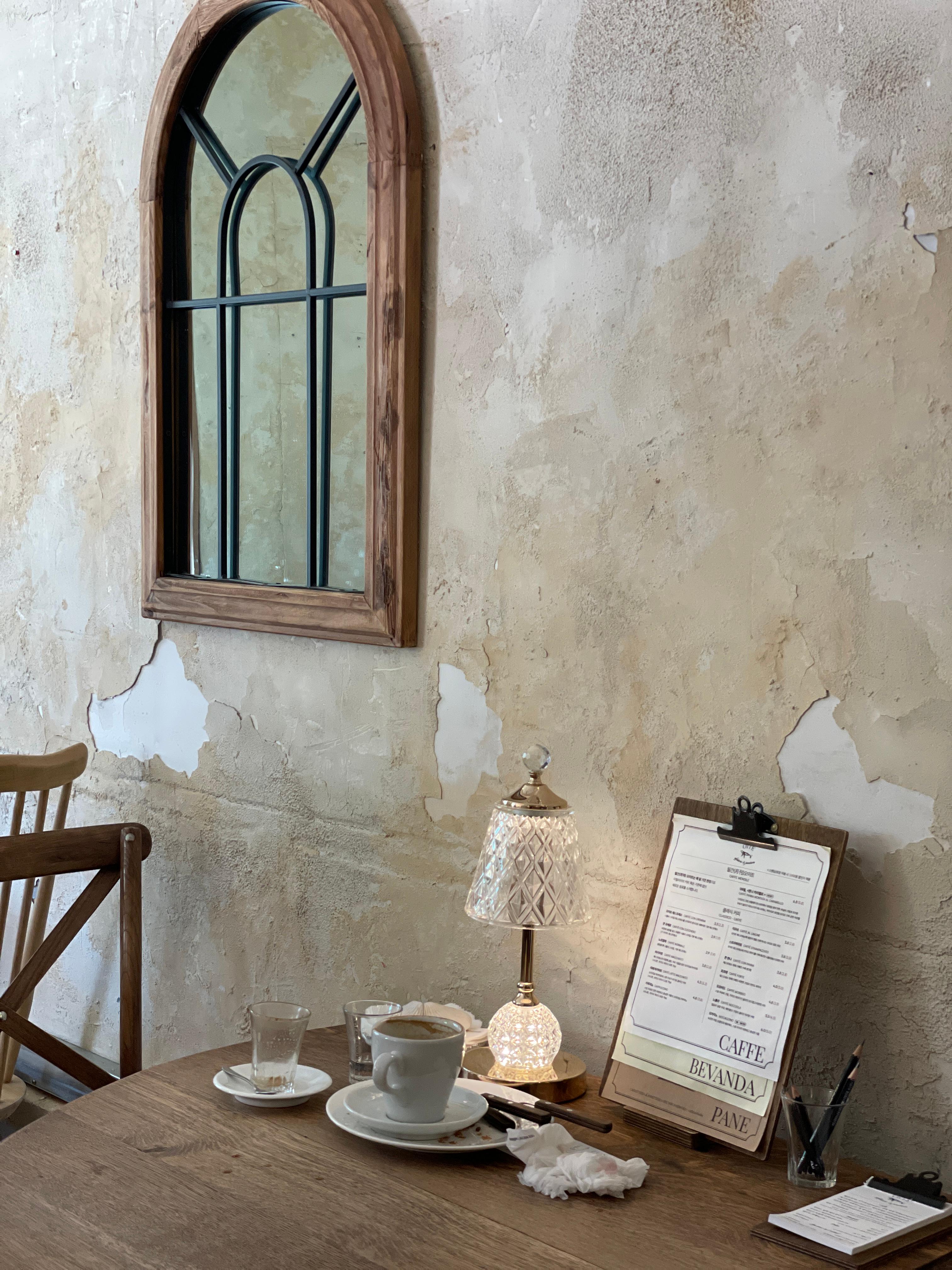 우트톤의 둥근 반원 모양 테이블과 약간는 이국적인 느낌이 나는 소품들이 이 카페 분위기를 따뜻하게 만들어 주었던 것 같아요.