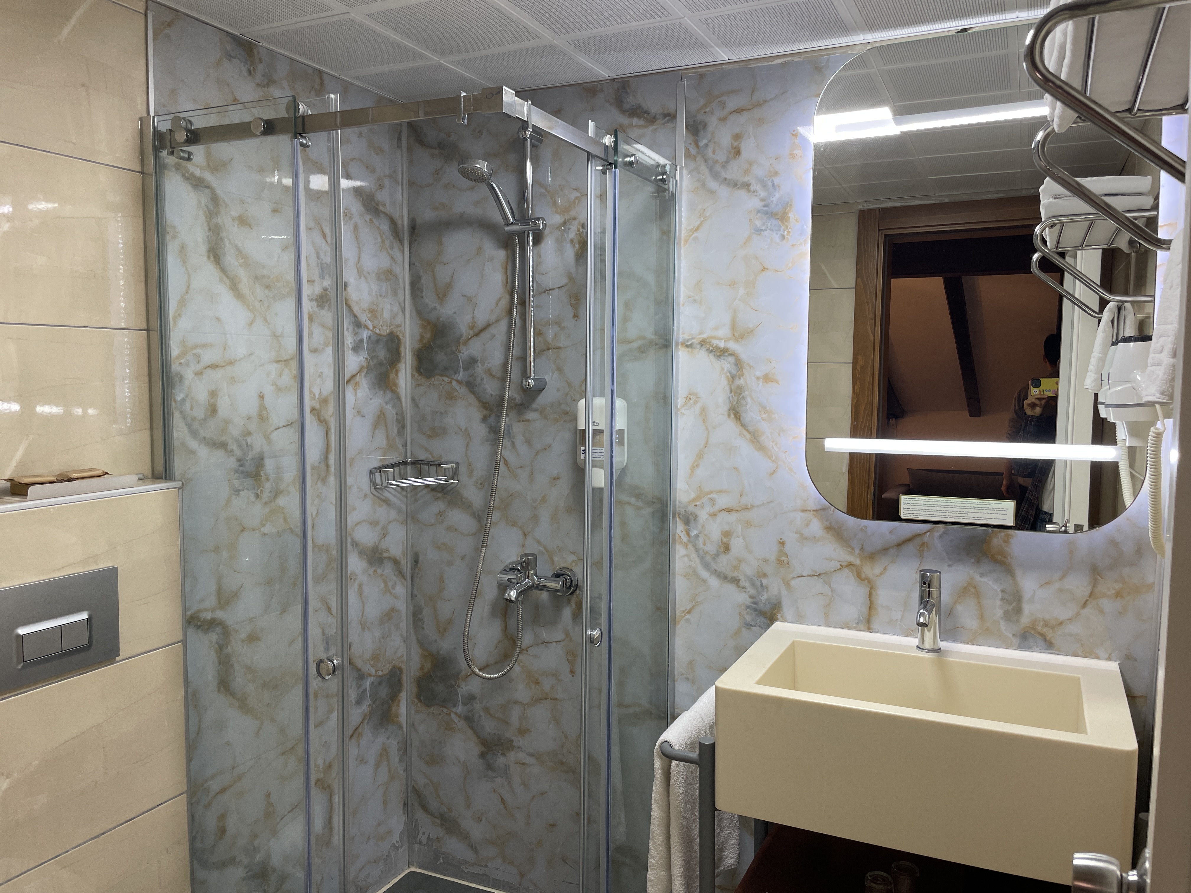 온수도 잘 나오고 2층이라 천장이 조금 낮은 단점이 있지만 이런 분위기도 나쁘지 않다.